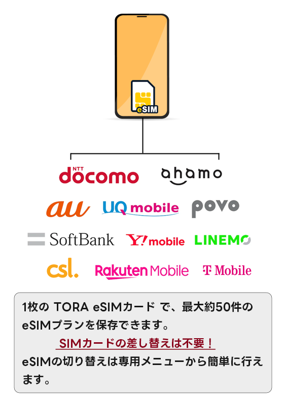 TORA eSIMカードは、eSIM非対応のスマートフォン・タブレット・PCでも、