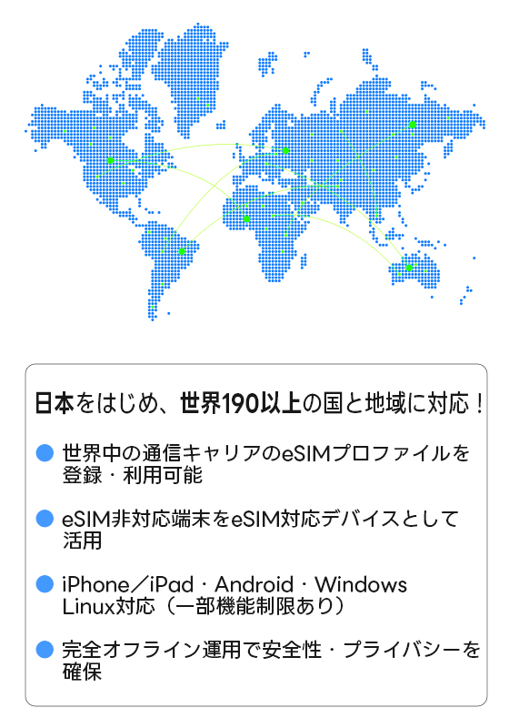 非対応端末でもeSIMの利用を可能にし、対応端末ではインストールできるeSIMの数を大幅に拡張します。